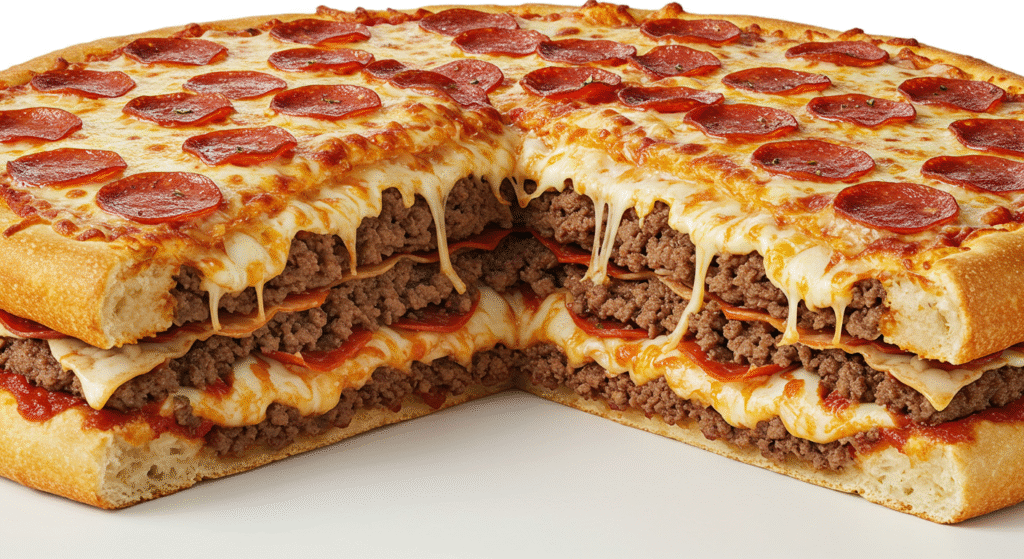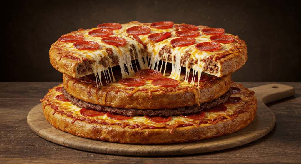 The Giant Double Cheeseburger Pizza isn’t just a recipe – it’s an experience. This revolutionary dish replaces traditional pizza dough with seasoned ground beef “crusts,” creating layers upon layers of burger and pizza flavors. The result is a towering, Instagram-worthy creation that combines the smoky richness of cheeseburgers with the cheesy indulgence of pizza.